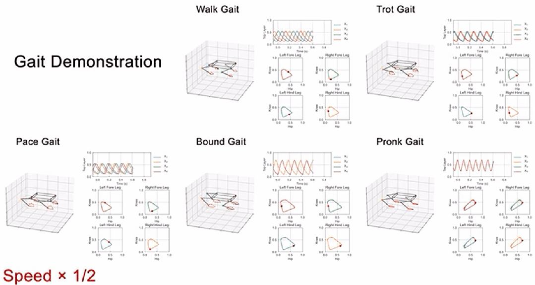 受数学中H/K定理的启发,团队首先论证了具有对称性的四神经元网络具备产生五种步态(行走、小跑、溜步、跳跑、腾跃)的理论潜力。这为多样化的步态生成提供了可能,然而,即便能够精确协调四条腿之间的交替规律,这个简单的四神经元网络在面对单条腿内部多个关节(如髋关节和膝关节)的协同控制时,却显得力不从心。