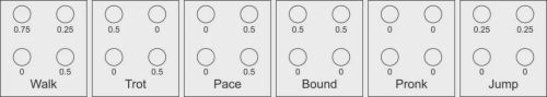 四足动物六种运动步态的相位关系:行走、小跑、溜步、跳跑、腾跃和跳跃