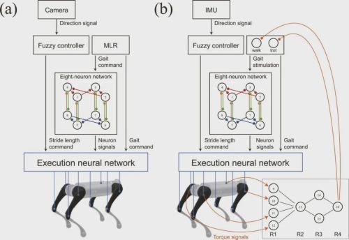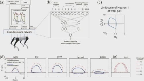 受此启发,研究人员长期致力于为四足机器人设计人造CPG,使其能够灵活自如地运动。然而,现有的四神经元CPG架构大多功能单一,能产生的步态数量非常有限,通常不超过三种,而自然界中的四足动物轻易就能展示出超过六种的主要步态;其次,可控自由度不足,机器人的一条腿通常有髋关节和膝关节等多个需要协调的自由度,四神经元CPG只能输出四个信号来控制腿间的交替规律,无法直接控制单条腿内部关节的协调运动。