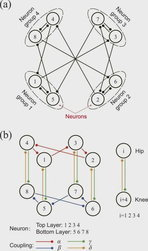 为了实现对髋关节和膝关节的独立、协调控制,研究团队在上述对称的四神经元网络基础上,进行了巧妙的扩展: