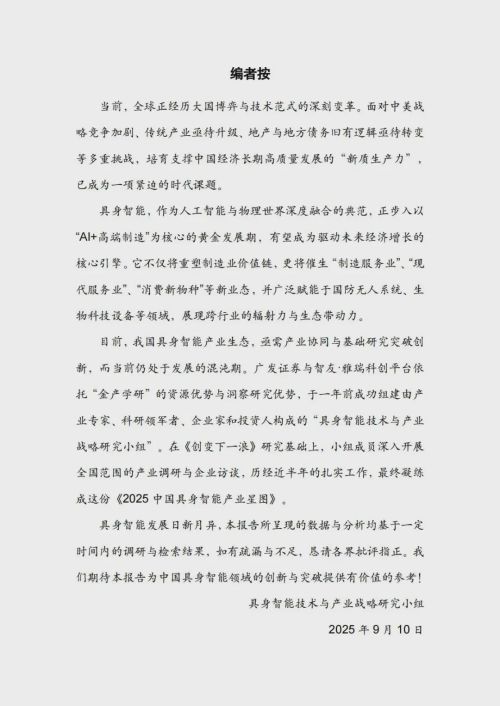 在全球大国博弈、产业格局重塑的关键节点,具身智能正快速跃升为“驱动未来经济增长”的核心引擎。9月10日,由广发证券、智友·雅瑞 科创平台联合研究的《2025中国具身智能产业星图》(完整报告版)正式发布!