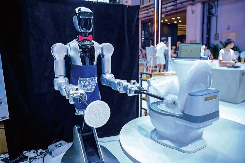 装配夹爪的“量子2号”机器人,在2025世界机器人大会展台演示使用清洁工具进行360度无死角全方位清洁。受访者供图