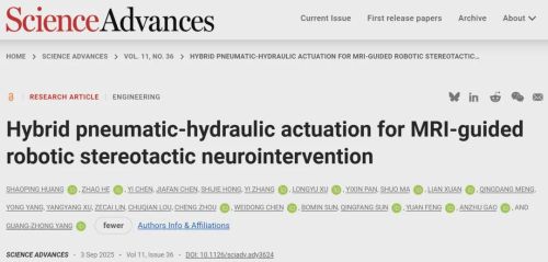 前不久,该项目最新研究成果的相关论文已以“Hybrid pneumatic-hydraulic actuation for MRI-guided robotic stereotactic neurointervention”为题,发表于《Science Advances》。论文共同第一作者为上海交通大学医学院附属同仁医院黄少平博士后与上海交通大学何钊博士后,通讯作者为上海交通大学杨广中教授、高安柱教授、冯原教授以及上海交通大学医学院附属瑞金医院孙青芳主任医师。研究得到了国家重点研发计划、国家自然科学基金及上海市科技专项等项目的资助,并受到工业和信息化部产业发展促进中心、磁共振诊疗高端技术国家工程研究中心、上海市科学技术委员会、上海市医疗机器人技术创新中心、上海市柔性医疗机器人重点实验室、上海交通大学医疗机器人研究院、上海交通大学生物医学工程学院、上海交通大学自动化与感知学院、上海交通大学医学院附属瑞金医院等单位的支持。