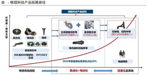精锻科技系国内乘用车精锻齿轮龙头,精锻齿轮全国市占率超40%。公司延伸发展差速器总成及行星架总成,逐渐实现集成式供货,单套价值由100元(4颗锥齿轮)左右提升至200元左右(差速器总成)。