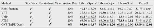 在LIBERO基准测试中,GVF-TAPE与多个最先进的方法进行了对比。结果显示: