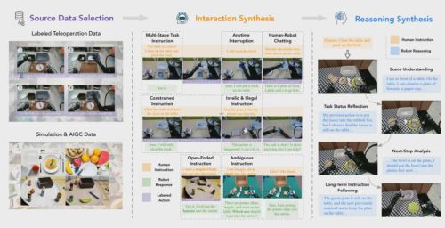 第二阶段是有监督微调,旨在让Robix学会与人协作。研究团队通过合成大量人机交互数据,教Robix如何扮演一个“听话且聪明”的机器人助手。训练场景包括多阶段指令、带约束的任务、开放式指令、随时打断、无效或模糊指令的处理等。这些数据被转化为逼真的交互轨迹,让Robix不仅会规划,更会“沟通”。
