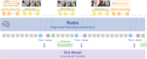 在核心架构上,Robix处于分层机器人系统的高层认知层,负责解释任务并对多模态输入进行推理,从而生成语言响应和行动计划;而低级控制器(通常是视觉-语言-动作 (VLA) 模型)则负责执行 Robix 生成的原子命令。这种分层设计使机器人能够与人类和物理环境无缝交互。