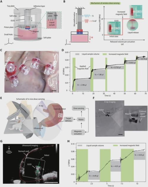 团队开发了一种胶囊型机器人,内部包含药物储腔、磁性活塞和与EUSS连接的软条。当外部磁场驱动活塞运动时,药物被推出微孔,同时EUSS受拉发生形变。通过监测回波频率的变化,系统可反推出释放的药物体积。