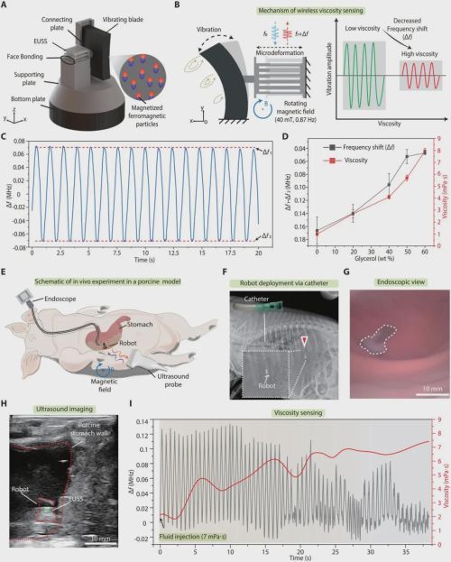 研究团队设计了一种粘度传感机器人,其振动板由磁驱材料制成,与EUSS相连。在旋转磁场中,振动板发生周期性运动,其振幅受周围流体粘度阻尼的影响。通过EUSS检测振动幅度对应的频率偏移,即可推算出环境粘度。