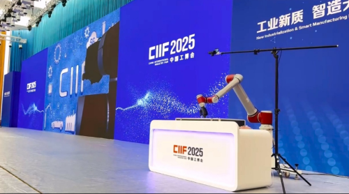 节卡机器人在开幕式上献上了一场沙画表演,两台JAKA Zu20 协作机器人同步创作,以沙粒勾勒出“CIIF”图示。