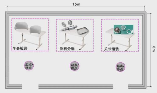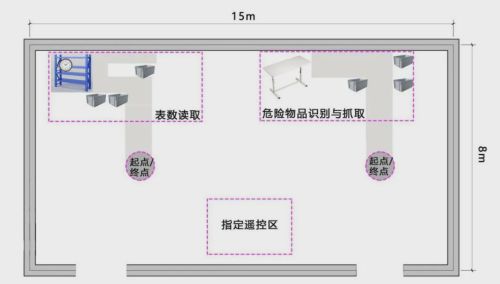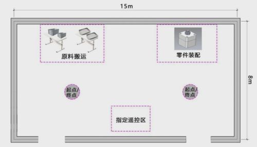 工业制造场景(自主完成)是具身智能落地的核心领域,本赛项设置车身检测、物料分选、关节组装3项任务,模拟汽车制造、零部件加工等真实场景,场地总体尺寸为长15m、宽8m,起点/终点为半径0.5m的圆形区域,作业区与起点垂直距离1.5m。