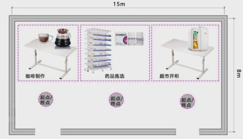 商用服务场景(自主完成)设置咖啡制作、药品拣选、超市开柜3项任务,考验机器人的双臂协作、力控精度与指令理解能力。场地总体尺寸长15m、宽8m,超市开柜的起点/终点尺寸是半径为0.5m的圆形区域,中心位置位于场地中心线上且距离作业区的垂直距离为1.5m。