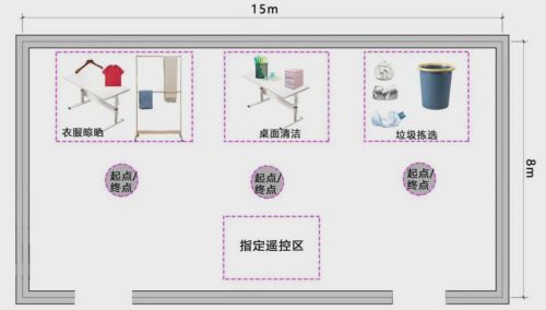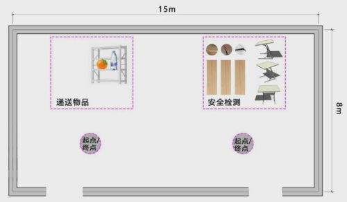 居家服务场景(自主完成)模拟日常家庭需求,设置递送物品、安全监测2项任务,考验机器人的语音交互、环境风险识别能力。递送物品、安全检测的起点/终点尺寸是半径为0.5m 的圆形区域,中心位置位于场地中心线上且距离作业区的垂直距离为1.5m。