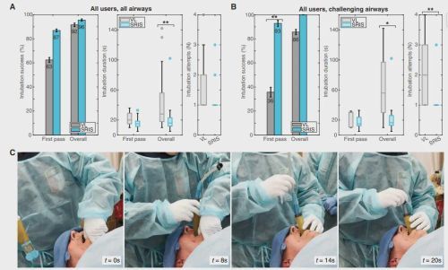 在最新的尸体模型实验中,这项技术展现出惊人的效果:首次插管成功率达87%,总体成功率高达96%,平均插管时间仅需21秒。相比之下,使用传统视频喉镜的成功率分别为63%和92%,平均耗时44秒。