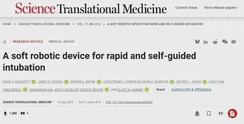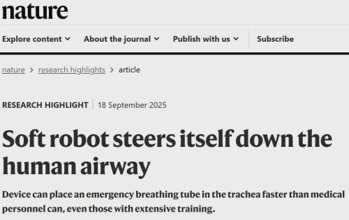 相关研究成果以:A soft robotic device for rapid and self-guided intubation为题,发表在《Science Translational Medicine》期刊上,并被Natrue亮点报道。这项突破性技术有望改变急救医疗,特别是在院前急救、战地医疗和医疗资源匮乏地区。