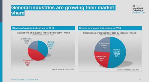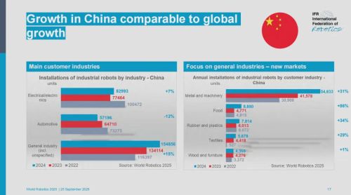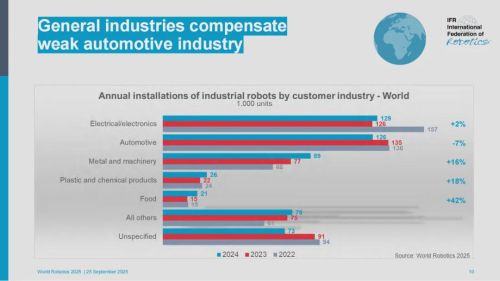 行业结构的演变是本次报告的一大亮点。传统的机器人应用霸主——汽车行业,在2024年出现了7%的安装量下滑。然而,这一颓势被“通用工业”的强劲增长所完全抵消,这其中电气/电子行业2024年安装量为12.9万台,同比增长2%;金属与机械行业增长16%;塑料与化工产品行业增长18%,食品行业大幅增长42%。