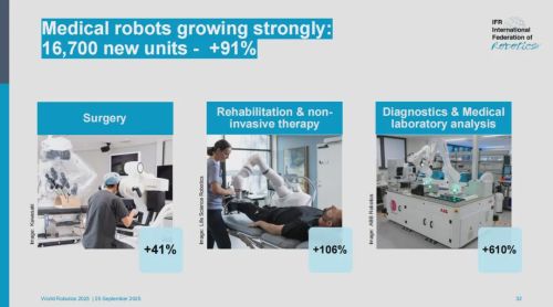 医疗机器人是2024年增长最快的板块,新安装量达1.67万台,同比飙升91%。其中手术机器人增长41%,技术持续成熟;康复与非侵入性治疗机器人增长106%,市场需求巨大;诊断与医学实验室分析机器人实现了惊人的610%增长,成为最大亮点