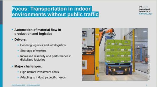 报告特别强调了在室内非公共道路环境下的运输机器人(主要是自主移动机器人AMR)的迅猛发展。其驱动力在于全球物流和内部物流的繁荣、劳动力短缺的加剧,以及数字化工厂对可靠性和效率的更高要求。然而,高昂的前期投资成本和适应特定行业需求的复杂性,仍是其大规模普及的主要挑战。