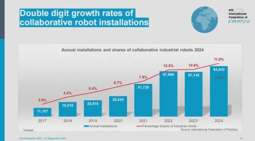 协作机器人(Cobots)继续以其高灵活性、易部署的特点,成为工业机器人领域最亮眼的增长点,实现了12%的双位数年增长率。这表明人机协作的生产模式正得到越来越多企业的认可,尤其在中小企业中普及迅速。