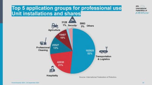 在专业服务机器人领域,物流与自动化正成为引领市场风潮的核心力量。2024年,该领域展现出强劲的增长势头,新型机器人安装量达到19.9万台,实现了9%的同比增长。从应用格局来看,市场高度集中,运输与物流板块以10.29万台的安装量独占鳌头,占据了52%的绝对主导份额;酒店与专业清洁领域紧随其后,分别占21%和13%;而农业与安全领域则分别占比10%和1%。