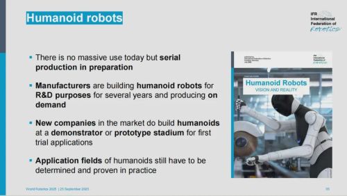 在人形机器人方面,报告对此持审慎乐观态度。目前,单用途人形机器人已有少量商业部署宣布,但真正的多用途人形机器人仍较为遥远。制造商们主要出于研发目的或在需求驱动下进行小批量生产,新入局者多处于演示或原型机阶段。人形机器人的实际应用领域仍需在实践中探索和验证。