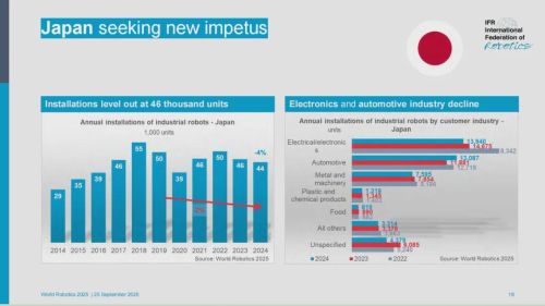 相比之下,传统机器人强国日本的市场则显得动力不足,安装量徘徊在4.6万台,同比微降2%。其核心的电子和汽车行业对机器人的需求均出现下滑,亟待寻找新的增长动力。