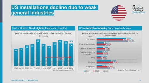 美国市场在2024年安装量的历史第三高位,但同比略有下滑(-9%)。其主要原因在于通用工业的疲软,而其汽车行业则重回增长轨道。