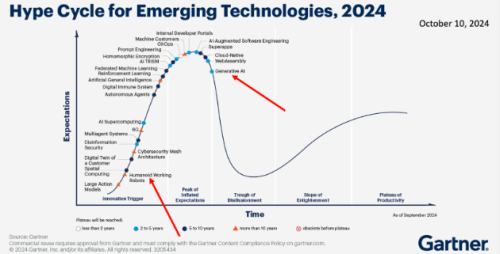 近来,新一代研究者偶然萌生了制造人形机器人的想法,你可能也注意到了相关的一些宣传热度。高德纳(Gartner)表示,目前人形机器人仍处于发展初期,远未达到宣传热度的峰值。下图距今仅一年,从中可看出,人形机器人正处于发展周期的起点,而生成式人工智能已过峰值,正朝着低谷期回落: