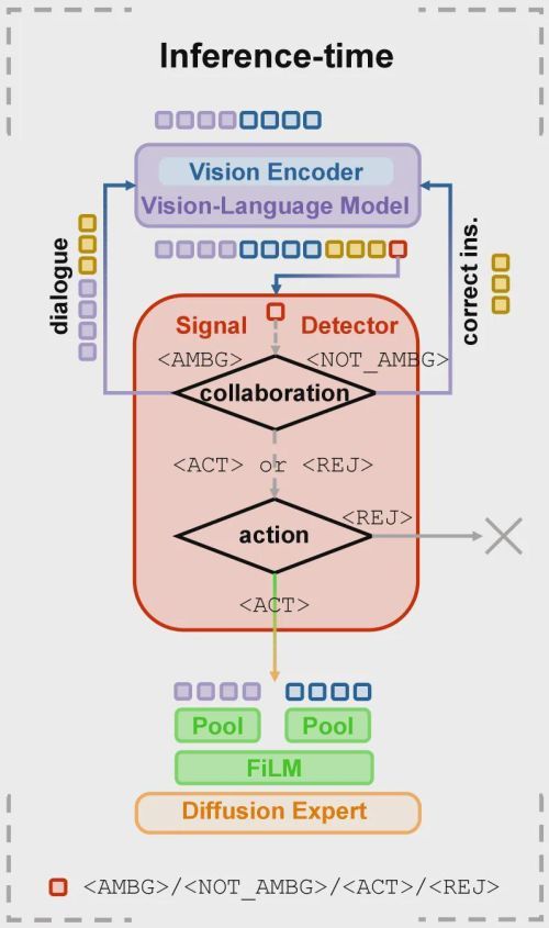 “Ask-to-Clarify”框架由两个关键组件组成:负责协作的视觉-语言模型(VLM)和专门生成动作的扩散模型。