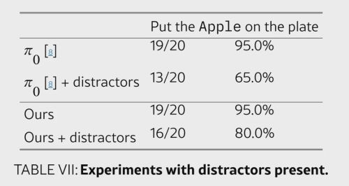 当环境中存在相似物体干扰时(例如苹果与石榴并存),该框架仍能维持80%的成功率,明显高于传统模型的65%。这种对复杂环境的强适应能力,源于框架设计中视觉编码器的冻结策略,使智能体能够更好地应对视觉变化,而传统模型往往因对训练数据过度拟合,难以适应现实世界的多变场景。
