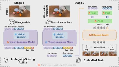 为了解决这一核心挑战,来自复旦大学的研究团队提出了“询问澄清”(Ask-to-Clarify)框架,通过多轮对话澄清歧义后,端到端生成低级动作,实现具身智能体从“被动执行者” 到 “主动协作者” 的转型,为真实人机协作提供新路径。