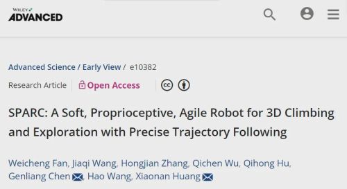 据研究团队介绍,这项将三维驱动、创新本体感知、运动学建模、鲁棒控制和高效规划策略相结合的工作,使SPARC成为目前已知首个能在三维地形中进行精确运动规划的软体机器人。前不久,该研究成果的相关论文已以“SPARC: A Soft, Proprioceptive, Agile Robot for 3D Climbing and Exploration with Precise Trajectory Following”为题,发表于《Advanced Science》期刊。