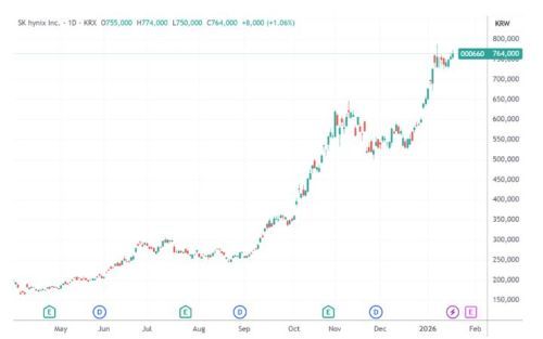 SK海力士的股价也因此水涨船高,从2024年底的约20.4万韩元飙升至2025年底的约76万韩元,全年涨幅约275%,成为全球表现最佳的芯片股之一。