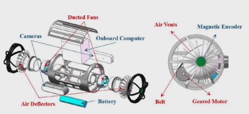 每个推进模块主要由一个涵道风扇、一个导流片、一个齿轮电机和一个磁编码器组成。涵道风扇负责产生基础推力,而导流片则像一扇可以转动的风向门,通过改变气流喷射方向,从而控制推力输出的方向。