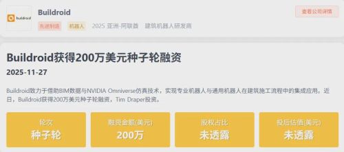 2025 年 11 月,Buildroid 完成 200 万美元种子前融资,由风险投资家Tim Draper领投。Tim Draper创办的 Draper Associates 基金曾早期投资特斯拉、SpaceX、Skype、Robinhood等企业,投资战绩辉煌。