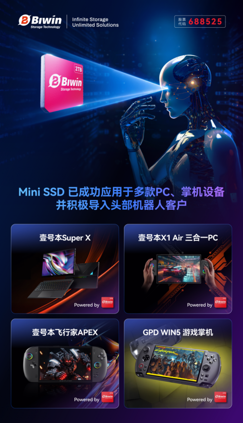 Mini SSD 已成功量产并应用于壹号本 OneXPlayer 游侠 X1 Air、飞行家 APEX、Super X 及 GPD Win 5 等多款智能设备,并面向个人消费市场正式发售。此外,产品实力亦赢得国际权威肯定,先后荣获 TIME “2025 年度最佳发明”、Embedded World 2025 “Best-in-Show” 大奖,以及助力公司获得 2025 年“中国芯”优秀支撑服务企业等多项荣誉。