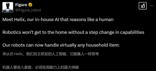 2025年2月,Figure AI与OpenAI“分家”后,发布了自主研发的端到端机器人VLA(视觉-语言-动作)通用大模型Helix。