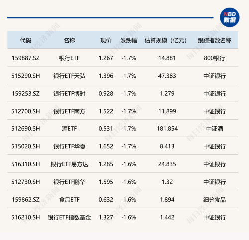 下跌方面,银行相关ETF跌超1%。