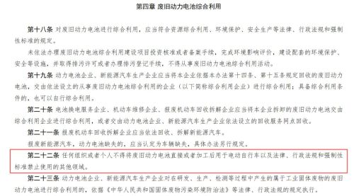 记者注意到,1月16日,工业和信息化部等六部门联合发布了《新能源汽车废旧动力电池回收和综合利用管理暂行办法》(以下简称《办法》),自2026年4月1日起施行。其中,《办法》明确规定“任何组织或者个人不得将废旧动力电池直接或者加工后用于电动自行车以及法律、行政法规和强制性标准禁止使用的其他领域。”