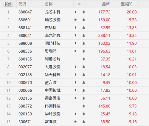 今日A股半导体板块全线飙升,多股股价创区间新高。算力芯片、尤其是CPU概念股涨幅居前,其中龙芯中科20CM涨停,海光信息涨超13%创历史新高,中国长城涨停,澜起科技等跟涨。