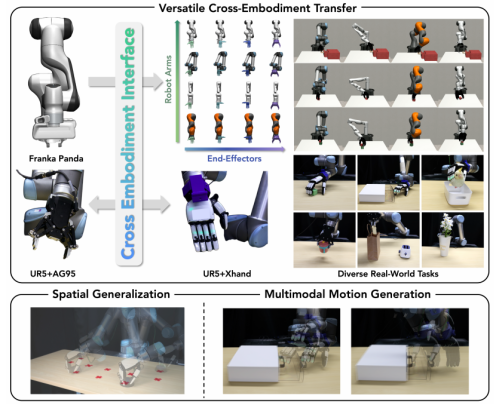 近日,由清华大学深圳国际研究生院、南洋理工大学机械与航空航天工程学院联合研发团队开发了Cross-Embodiment Interface(CEI)跨形态学习框架,该框架跳出机器人物理形态限制,通过功能相似性技术,实现不同机器人间高效技能迁移。仿真与真实场景验证显示,CEI可将Franka Panda的技能迁移到16种不同形态机器人,支持UR5+AG95夹爪机器人与UR5+Xhand灵巧手双向迁移,平均成功率达82.4%。