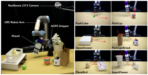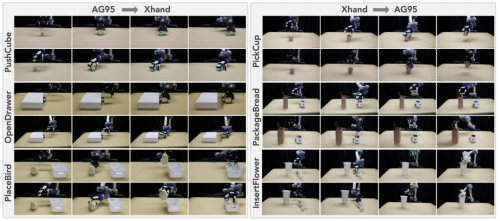 真实世界实验以UR5机械臂为基础平台,搭配AG95平行夹爪和Xhand灵巧手,开展双向技能迁移,涵盖6类日常任务: