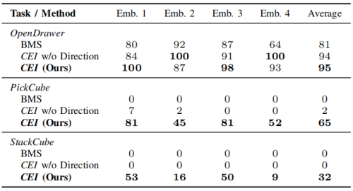 实验任务包括开门、抓立方体、叠立方体,演示数据来自Franka Panda的人工遥操作记录,通过CEI迁移到其他15种机器人。