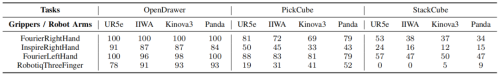 灵巧手整体表现优于三指夹爪,FourierRightHand和FourierLeftHand在所有任务中保持高成功率;RobotiqThreeFinger在叠立方体任务中表现较差,受限于运动学结构,接触稳定性不足。