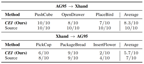 每组任务收集25条源机器人演示数据,经CEI迁移到目标机器人后,进行10次重复测试。
