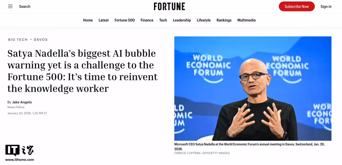 当地时间 1 月 20 日,据《财富》杂志报道,在瑞士达沃斯举行的世界经济论坛年会上,微软 CEO 纳德拉与论坛临时联席主席、贝莱德 CEO 拉里 · 芬克展开对话。纳德拉指出,如果 AI 的增长完全依赖资本堆砌,而缺乏真实的生产率改善,那么市场很可能正在形成泡沫。