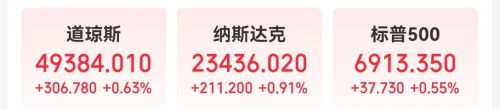 截至收盘,美股三大指数收盘集体上涨,道指涨0.63%,纳指涨0.91%,标普500指数涨0.55%。