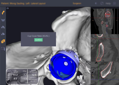 患者为一名长期受重度髋关节疼痛及功能障碍困扰的老年人,影像学显示其髋臼存在罕见的双区域骨缺损,传统术式如高位髋中心、Jumbo杯或单一Augment等均难以兼顾假体稳定性与解剖复位需求。面对这一临床难题,蔡子龙医生团队借助锟铻®机器人强大的亚毫米级三维重建、智能规划与实时导航能力,首创将两个Augment模块拼合使用,构建出定制化的“Footing假体”——如同为髋臼假体打造一个精准贴合的“生物型基座”,不仅显著提升骨覆盖率,更将关节旋转中心恢复至生理位置,从根本上保障假体长期存活率。