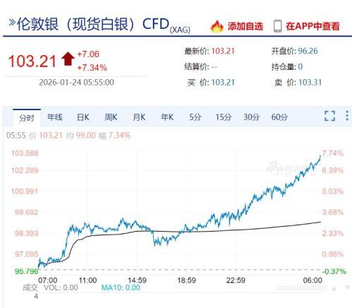 现货白银涨7.34%,报103.21美元/盎司。