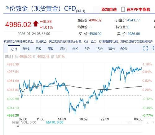 现货黄金涨1.01%,报4986.02美元/盎司。